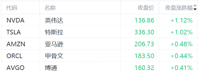 感恩节假期归来,明星科技股夜盘时段普涨,截止发稿 英伟达特斯拉均涨超1%,亚马逊涨约0.5%: