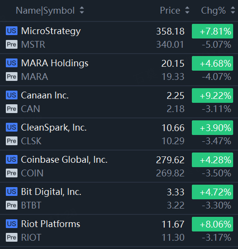 Crypto shares dropped in premarket trading. MicroStrategy fell 5%; MARA Holdings fell 4%; Canaan Inc., $ CleanSpark, Inc., Coinbase Global, Inc. fell over 3%.