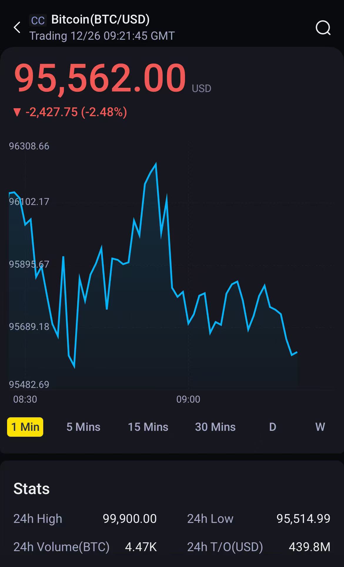 Bitcoin fell 2.48% to $95,562 on Thursday.