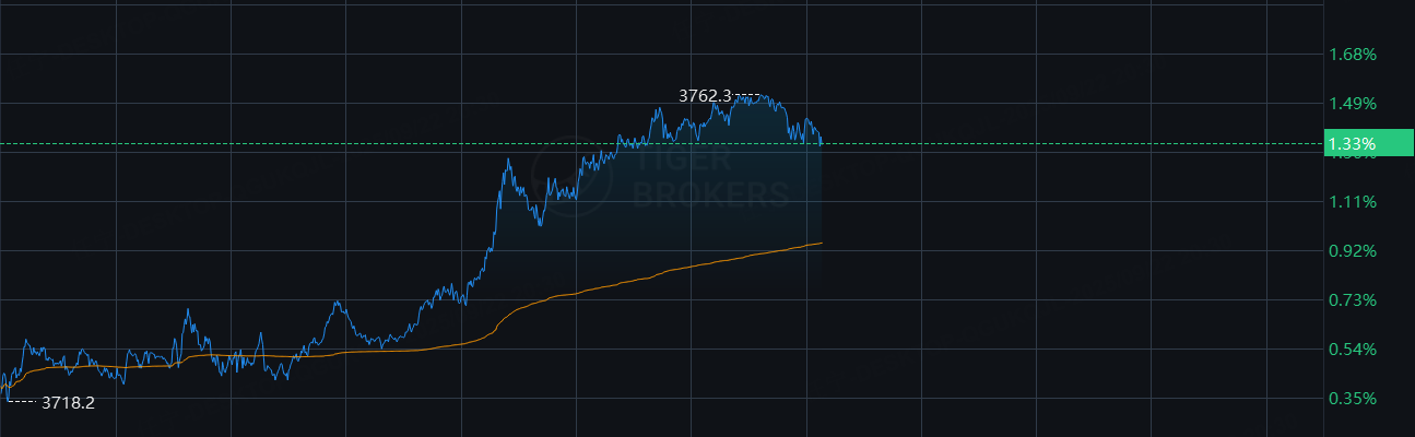 黄金自日内高位小幅回落,维持1%以上的涨幅。
