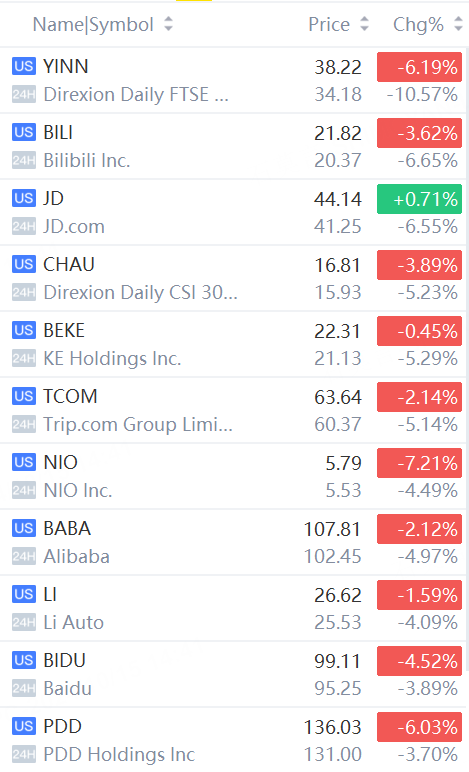 YINN tumbles over 10%; JD.com, Bilibili drop over 6%; CHAU, Trip.com, KE Holdings fall over 5%; NIO, Alibaba, Li Auto, PDD Holdings dip over 4%.