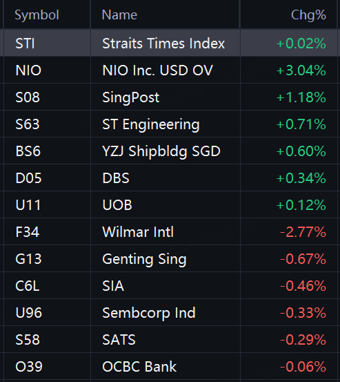 Singapore stocks opened higher on Friday. STI rose 0.02%; NIO rose 3%; SingPost rose 1%; DBS rose 0.3%; Wilmar fell 3%; SIA fell 0.5%.