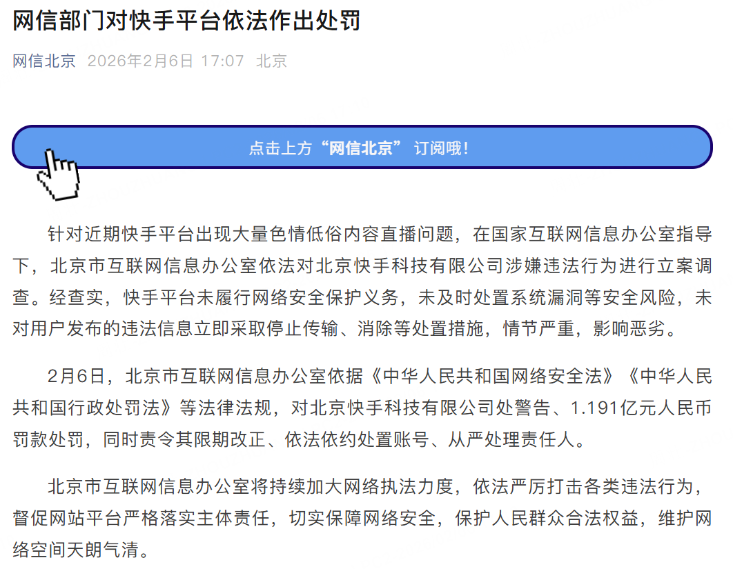 2月6日,针对近期快手平台出现大量色情低俗内容直播问题,在国家互联网信息办公室指导下,北京市互联网信息办公室依法对北京快手科技有限公司涉嫌违法行为进行立案调查。经查实,快手平台未履行网络安全保护义务,未及时处置系统漏洞等安全风险,未对用户发布的违法信息立即采取停止传输、消除等处置措施,情节严重,影响恶劣。