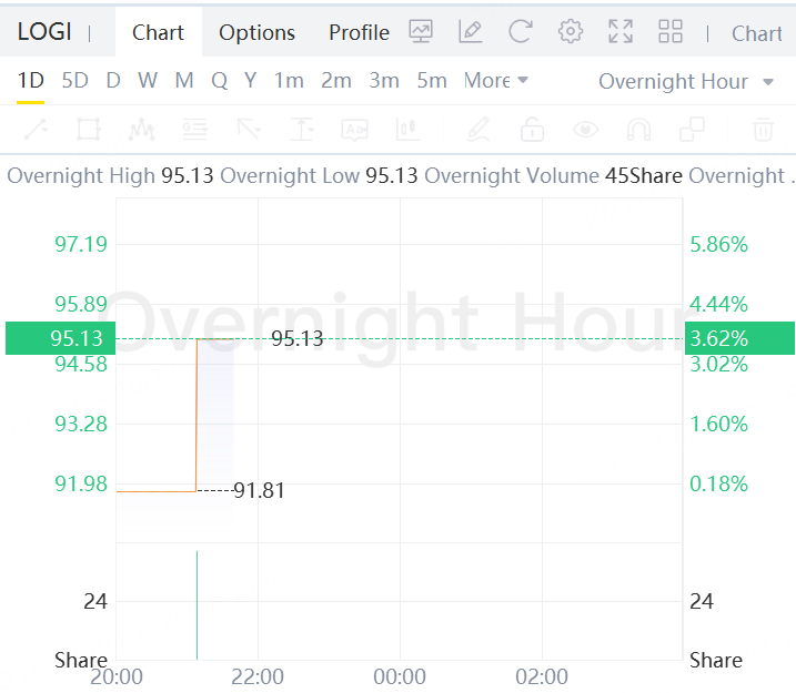 Logitech shares gained 3.6% in overnight trading. Logitech International raised its full-year outlook after a strong performance in the second quarter, the computer keyboard and mouse maker said on Tuesday.