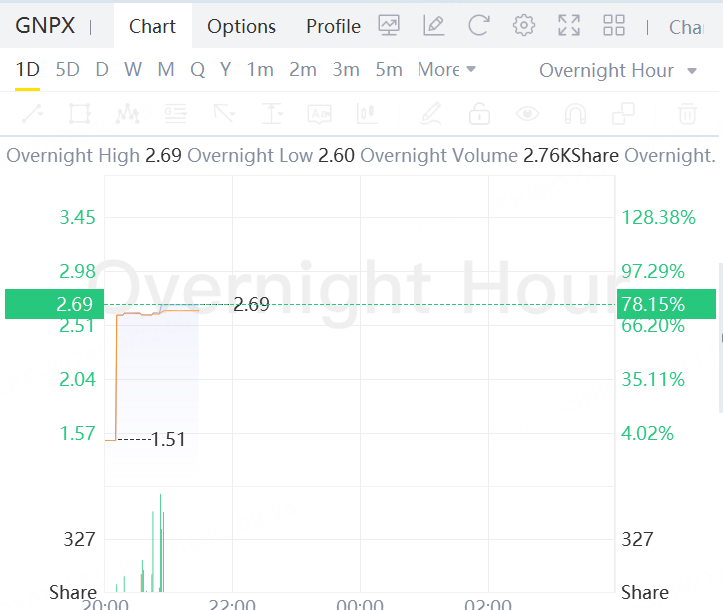 Genprex, Inc. shares were up more than 78% in overnight trading. Genprex said Tuesday a safety review committee approved the increase in dosage to the maximum level of 0.12 mg/kg in the phase 1 trial of its drug candidate, Reqorsa, to treat small-cell lung cancer.
