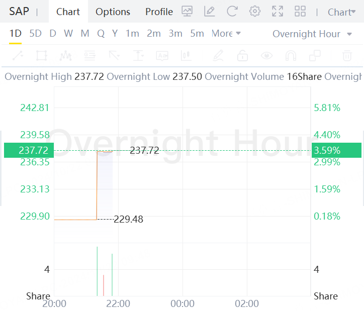 SAP shares rose 3% in overnight trading. SAP posted higher revenue and profit in the third quarter boosted by artificial-intelligence demand, and raised its full-year outlook.