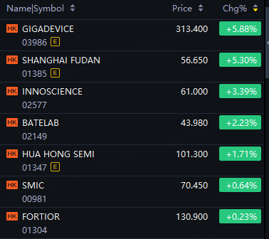 GigaDevice up 6%; Shanghai Fudan up 5%; InnoScience up 3%; Hua Hong Semi up 2%; SMIC up 1%.