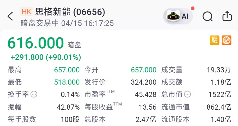 老虎暗盘|思格新能盘初暴涨超90%,每手赚超29000港元