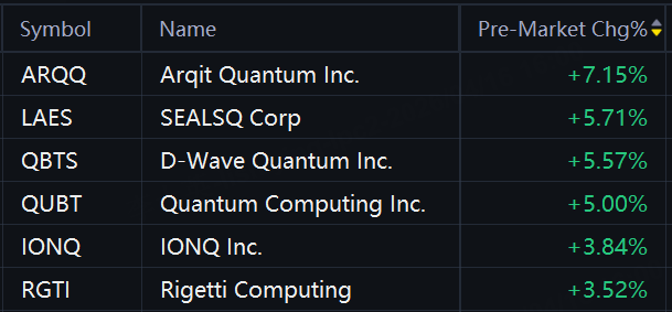 Quantum computing stocks jumped again in premarket trading. Arqit Quantum rose 7%; Sealsq and D-Wave Quantum rose 6%; Quantum Computing rose 5%; IonQ and Rigetti Computing rose 4%.