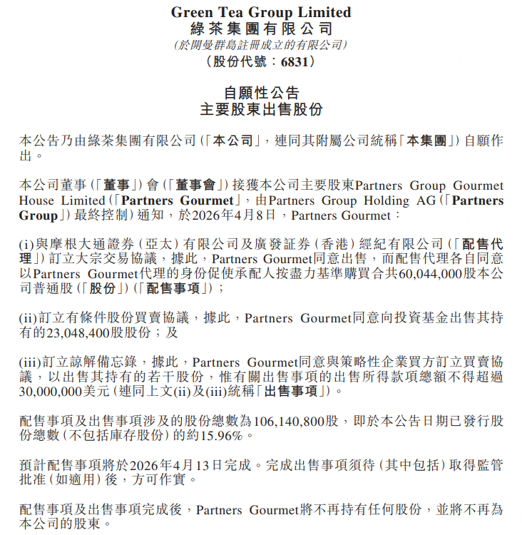 周四, 绿茶集团 持续走低,盘中大跌11%。公司发布公告:主要股东Partners Group Gourmet House Limited(Partners Gourmet)计划清仓式减持约15.96%公司股份,不再持有任何股份,并将不再为公司股东。