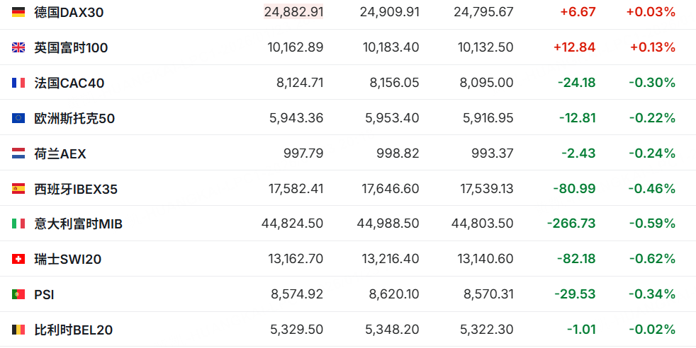 欧洲主要股指跌多涨少,德国DAX30涨0.03%,法国CAC40跌0.30%。