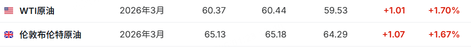 原油期货上涨,截止发稿,WTI原油涨1.70%,报60.37美元/桶;布伦特原油涨1.67%,报65.13美元/桶。