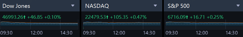 The U.S. major indexes closed as follows: Dow Jones up 0.10% at 46,993.26; S&P 500 up 0.25% at 6,716.09; NASDAQ up 0.47% at 22,479.53.