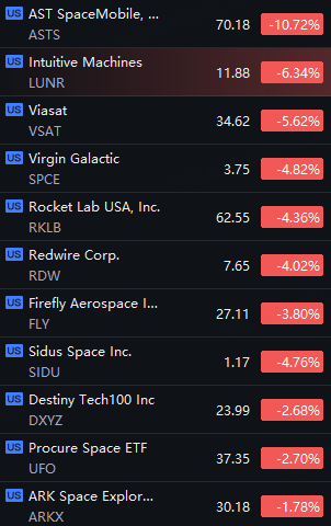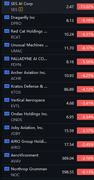 Space, Drone Stocks Tumbled. SES AI down 13%; AST Spacemobile down 11%; Draganfly down 9%; Intuitive Machines, Red Cat and Unusual Machines down 6%.