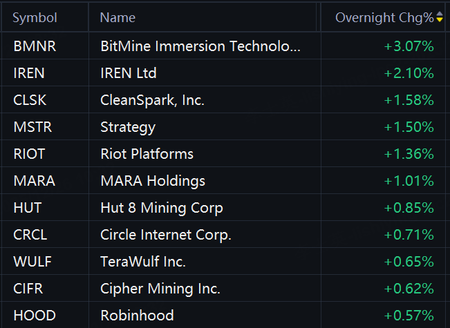 Crypto stocks gained in overnight trading as bitcoin topped $89,000. BitMine rose 3%; IREN, CleanSpark, and Strategy rose 2%; Riot Platforms and MARA Holdings rose 1%.