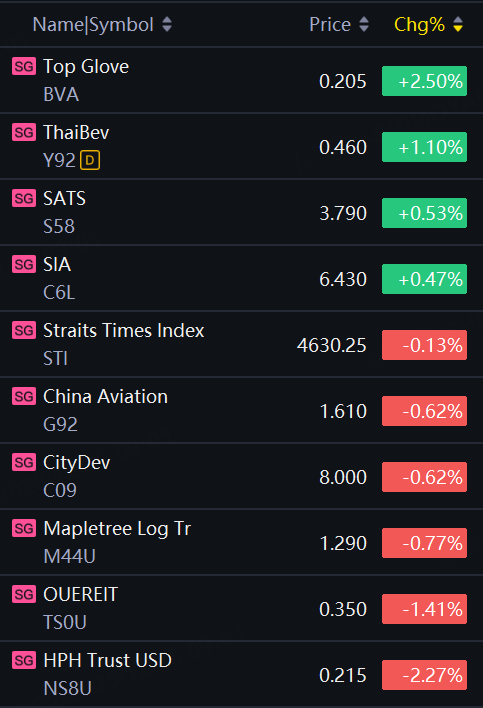 Singapore stocks opened lower on Friday. STI fell 0.13%; Top Glove up over 2%; ThaiBev up over 1%; SATS, SIA up slightly; OUEREIT down over 1%.
