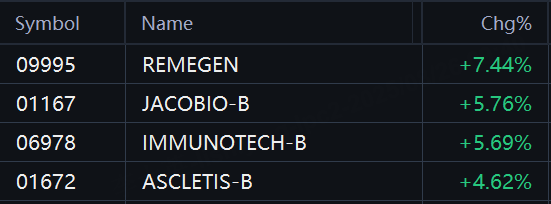 Biotech stocks rose against the trend in Hong Kong. RemeGen rose 7%; Immunotech Biopharm and Jacobio Pharmaceuticals rose 6%; Ascletis Pharma rose 5%.