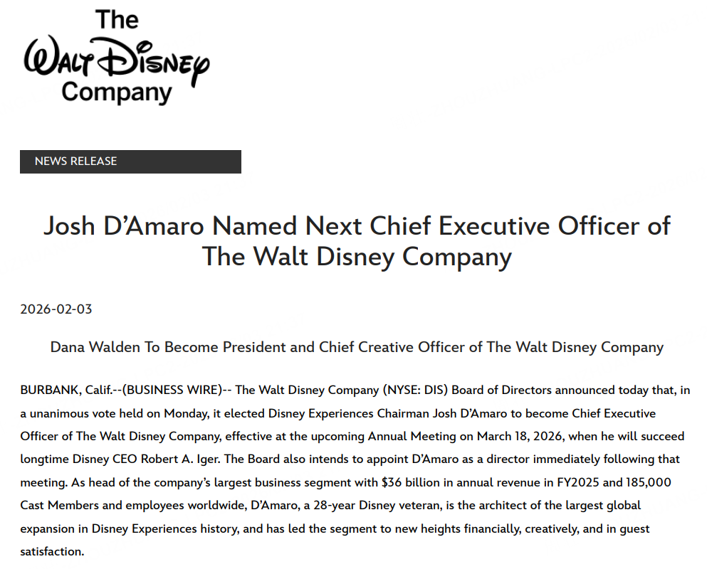 2月3日,华特迪士尼公司董事会今日宣布,经周一一致投票,董事会选举迪士尼体验业务董事长乔什·达马罗(Josh D'Amaro)出任华特迪士尼公司首席执行官,该任命将于2026年3月18日举行的年度股东大会上生效,届时他将接替长期担任迪士尼首席执行官的鲍勃·艾格(Robert A. Iger)。董事会还计划在股东大会结束后立即任命达马罗为董事。