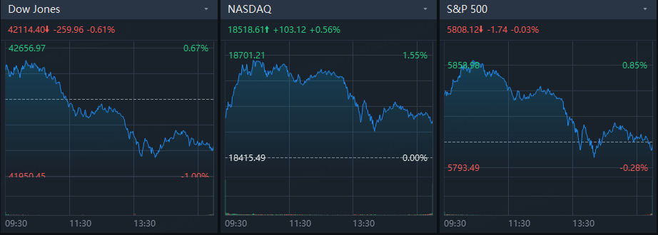 The Dow Jones Industrial Average fell 0.61% to 42,114.40, the S&P 500 eased 0.03% to 5,808.12 and the Nasdaq Composite rose 0.56% to 18,518.61.