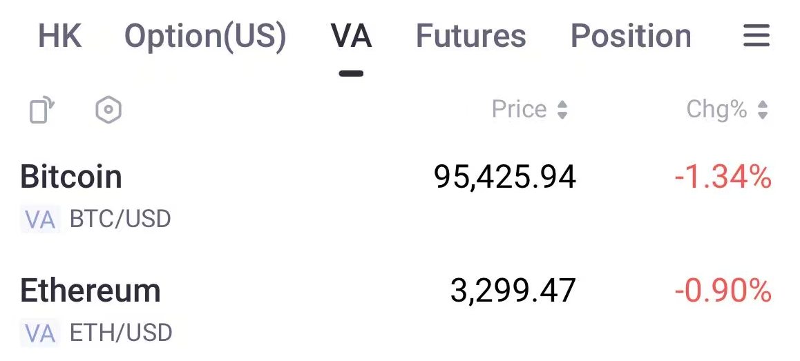 Tiger Trade行情显示,BTC回落至95425美元,24H降幅1.34%;ETH跌至3299美元,日内降幅0.90%。
