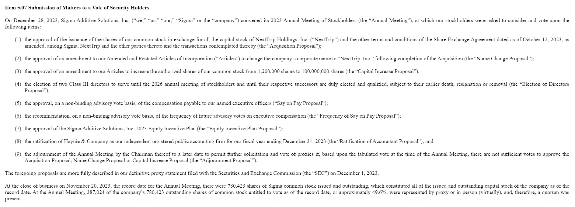 Due to difficulties securing votes from a significant number of Sigma’s stockholders, the company elected to adjourn the Annual Meeting in part in order to allow additional time for stockholders to vote on proposals 2 and 3 set forth above. Proposals 1 and 4 through 9 were presented to stockholders and voted on at the Annual Meeting on December 28, 2023. Each of the proposals on which action was taken at the Annual Meeting was approved.