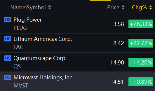 Solid state battery shares gained on Friday. Plug Power up 26%; Lithium Americas up 23%; Quantumscape up 4%.