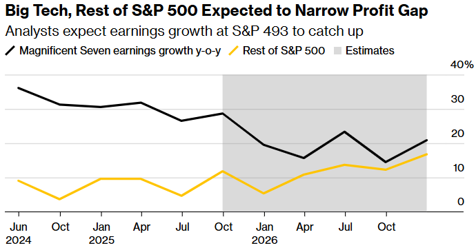 分析师预计“七大科技股”与标普500指数其他成分股之间的盈利增长差距将会缩小,因此投资者将目光转向了银行、消费品公司和矿业公司等传统经济行业。