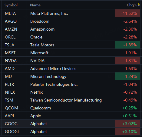 Big tech stocks fell in Thursday trading. Meta fell 12%; Broadcom fell 3%; Nvidia, Tesla, AMD, Microsoft, Oracle fell 2%; Palantir fell 1%; Alphabet rose 3%.
