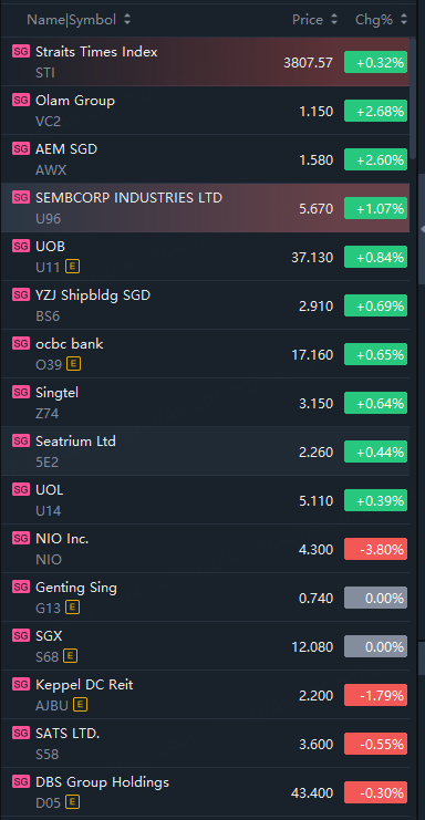 Singapore stocks opened higher on Wednesday. STI up 0.3%; Olam Group up 3%; UOB, Sembcorp up 1%; Nio fell 4%.