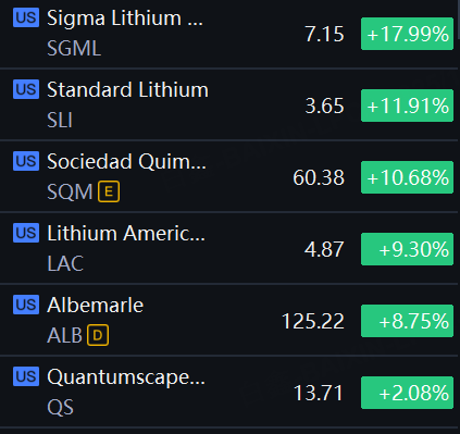 Lithium Stocks Shined. Sigma Lithium up 18%; Standard Lithium up 12%; Sociedad Quimica Y Minera and Albemarle up 9%; Quantumscape up over 2%;