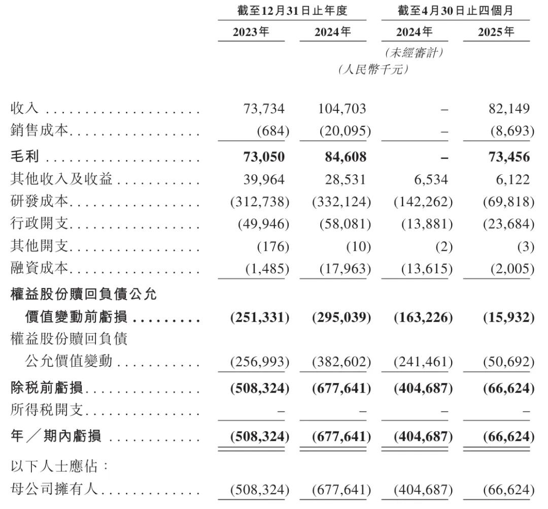 劲方医药2024年前4个月无营收,期内亏损为4.05亿元;2025年前4个月营收为8215万元,毛利为7346万元,年内亏损为6662万元。