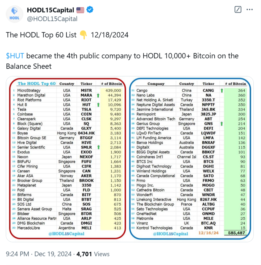 According to HODL15 Capital, Hut 8 has surpassed Tesla to become the fourth public company holding over 10,000 Bitcoin. The top three are MicroStrategy (439,000 BTC), Marathon Digital (44,394 BTC), and Riot Platforms (17,429 BTC).