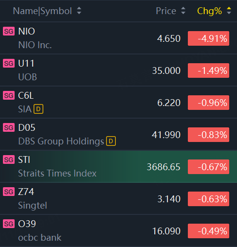 Singapore stocks opened lower on Wednesday. STI fell 0.7%; NIO fell nearly 5%; UOB, SIA, DBS fell around 1%.