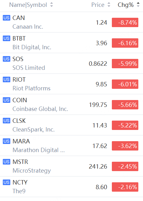 Shares of Coinbase Global Inc. dipped 5.66% after the largest US crypto exchange posted results below Wall Street expectations even though revenue almost doubled. Riot Platforms fell 6%; MicroStrategy fell 2%.