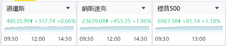 周二,美股三大指数延续涨势。标普500指数涨1.18%,报6967.38点;纳斯达克综合指数涨1.96%,报23639.08点,连续第十个交易日上涨;道琼斯工业平均指数涨0.66%,报48535.99点。