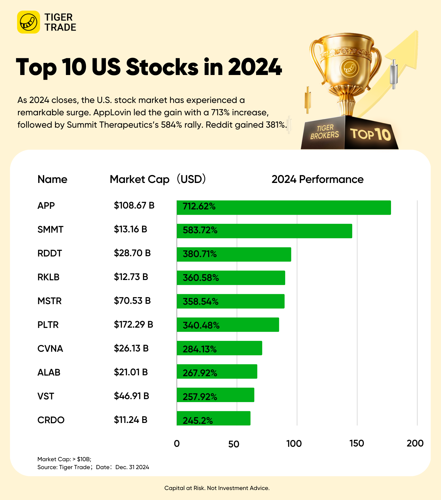 As 2024 closes, the U.S. stock market has experienced a remarkable surge, with the S&P 500 and Nasdaq rising 23.31% and 28.64% respectively this year. Top 2024 stock market performers include health care, AI, and Bitcoin stocks. AppLovin Corporation led the gain with a 713% increase, followed by Summit Therapeutics PLC’s 584% rally. Reddit gained 381%.