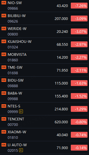 HK Popular Tech Stocks Dropped. Nio Down 7%; Bilibili, Weride And Kuaishou Down 3%; Mobvista and TME Down 2%.