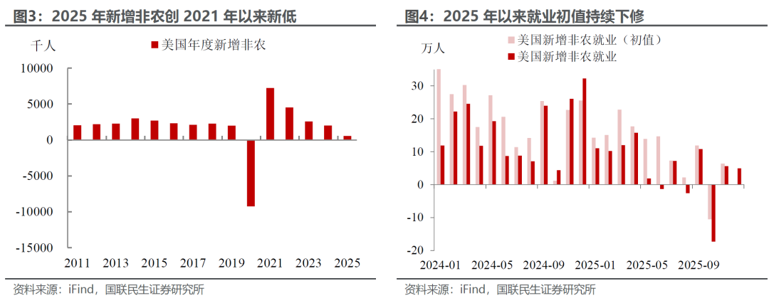 “忧”体现在整体就业中枢的下行和非农初值的持续下修。一方面,2025年全年非农就业人数增长约58万人,是2021年以来的最弱年度增长数据;另一方面,2025年年初以来,美国非农开始了持续的数据下修模式,本次也不例外,10-11月新增非农再度合计下修7.6万人,显示非农放缓趋势不容忽视。