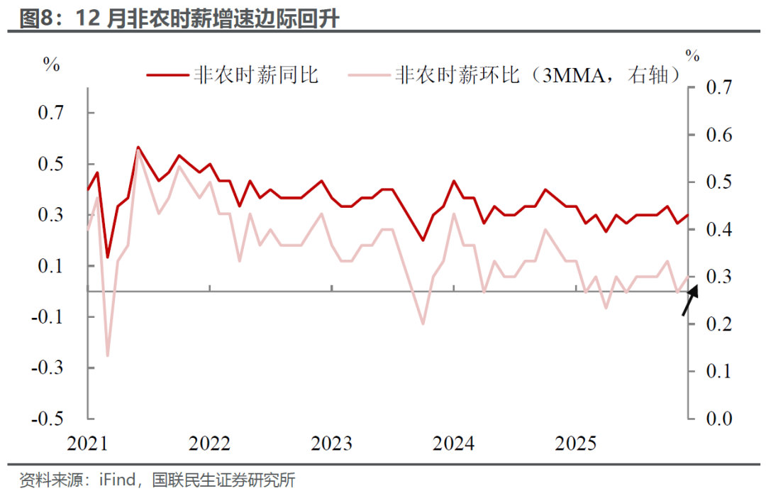 另一方面,薪资增速也有所回升。12月薪资环比增长回升至0.3%(前值0.2%),同比则大幅上升3.8%(前值3.6%),为2025年9月以来高值,这也进一步减轻了市场对劳动力市场衰退的担忧。但就如我们在以往的报告中强调的一样,高收入群体和低收入群体的收入结构性分化,可能高估了薪酬增速的中位数,所以也不能对支付能力的改善太过乐观。