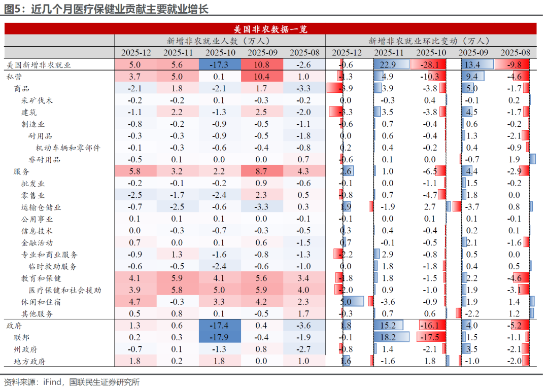 此外,虽然12月非农表现相对温和,但就业增长的广度问题仍然值得重视。12月非农增长5万人,整体接近预期的6.5万人,并未出现大幅偏离。但从结构上来看,医疗保健行业仍然是新增就业的主要驱动,除此之外,制造业、批发零售、运输仓储等多个行业新增就业仍出现负增长,这种极少数行业主导就业增长的格局对居民收入的广泛提升并不是件好事,甚至可能进一步加剧美国经济的“K型”分化。