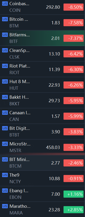 Coinbase fell 9%; Bitcoin Depot fell 8%; Bitfarms fell 7%; CleanSpark, Riot Platforms, Hut 8 Mining, Bakkt Holdings, and Canaan fell 6%; Bit Digital fell 4%; MicroStrategy fell 3%; while Marathon Digital rose 3%.