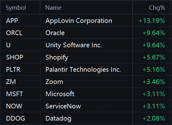 AppLovin rose 13%; Oracle and Unity Software rose 10%; Shopify rose 6%; Palantir rose 5%; Zoom rose 4%; Microsoft and ServiceNow rose 3%; Datadog rose 2%.
