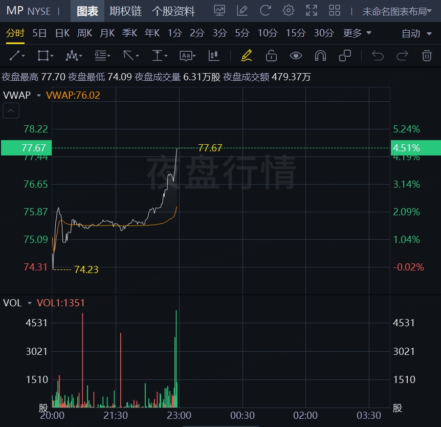 8月11日,美股夜盘时段,稀土概念股MP Materials盘中拉升,现涨超4%!消息面:美国战略资本办公室宣布通过国防部与MP Materials达成的协议提供首笔贷款,以确保关键材料供应链。
