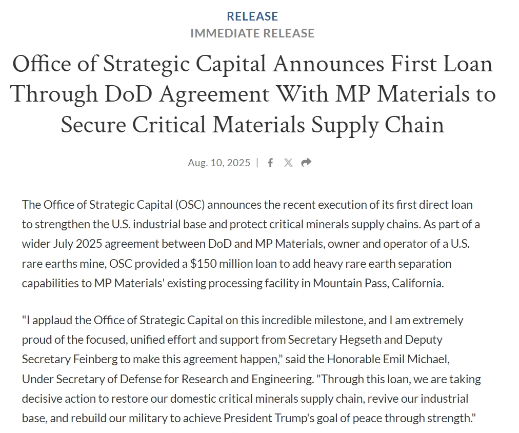 美国战略资本办公室 (OSC) 宣布近期发放首笔直接贷款,用于加强美国工业基础并保护关键矿产供应链。作为国防部与美国稀土矿所有者和运营商 MP Materials 于 2025 年 7 月达成的更广泛协议的一部分,OSC 提供了 1.5 亿美元贷款,用于为 MP Materials 位于加州芒廷帕斯的现有加工厂提升重稀土分离能力。
