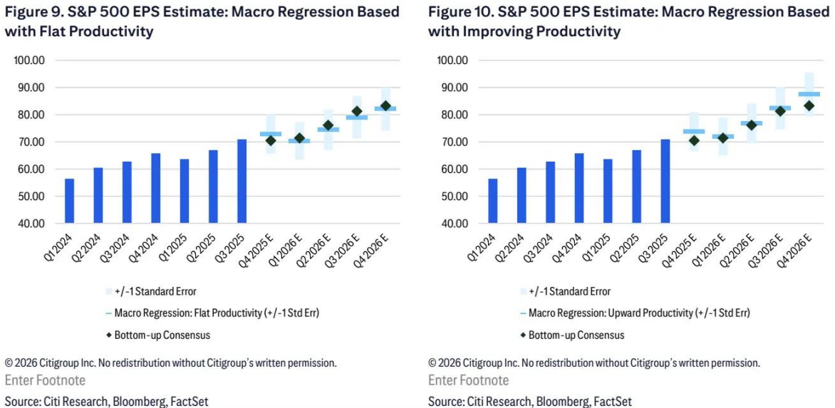 宏观影响:生产力依然关键——花旗基于宏观经济的回归分析凸显了生产力对标普500指数盈利增长的重要性。如果非农劳动生产率同比保持1.9%的水平,分析表明,2026年标普500指数的每股收益为306美元。如果生产率按季度增长0.23%,与2021年以来的趋势一致,则2026年的数字将上升至319美元。工业生产和房屋开工量触底反弹,加上成本压力缓解,将再次支撑标普500指数的盈利增长远超美国GDP增速。