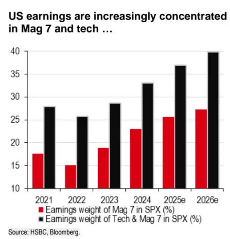 汇丰还指出,市场集中度高。投资者指出的最大风险之一是市场集中度不断上升。尽管预计Mag7的盈利增速将放缓,但仍将超过标普500指数的其他成分股。鉴于其规模,七巨头目前占标普500指数盈利的26%,加上科技股,约占总盈利的40%。随着七巨头和科技股继续超越大盘,这种集中度似乎还会进一步上升。预计到2025-2026年,超大规模数据中心运营商将占总资本支出的30-34%。