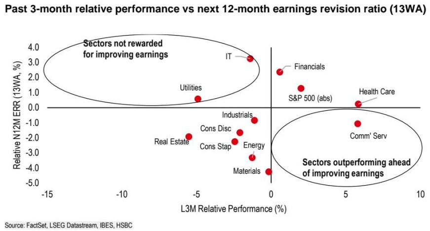 与前几个季度一样,汇丰筛选了标普500指数中盈利预期上调但估值偏低、股价下跌的公司(见以下表格)。该行还重点列出了尽管盈利预期下调但表现优异的行业(非必需消费品、公用事业、通信服务),以及尽管盈利预期上调但并未获得奖励的行业(金融)。