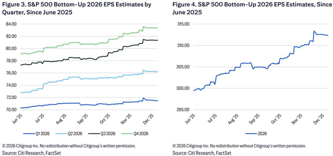 2026年盈利前景:预期上调持续——花旗预计2026年标普500指数成分股公司每股收益将升至其预测的320美元,高于目前底部向上共识预期的312美元。市场成长股板块,尤其是大型人工智能公司,将继续推动盈利预期。从盈利衰退中复苏的周期性行业可能会缓解此前普遍存在的预期下调趋势,从而部分抵消增长带来的负面影响。通信和金融板块的预期上调潜力最大,而必需消费品、工业和材料板块可能面临挑战。