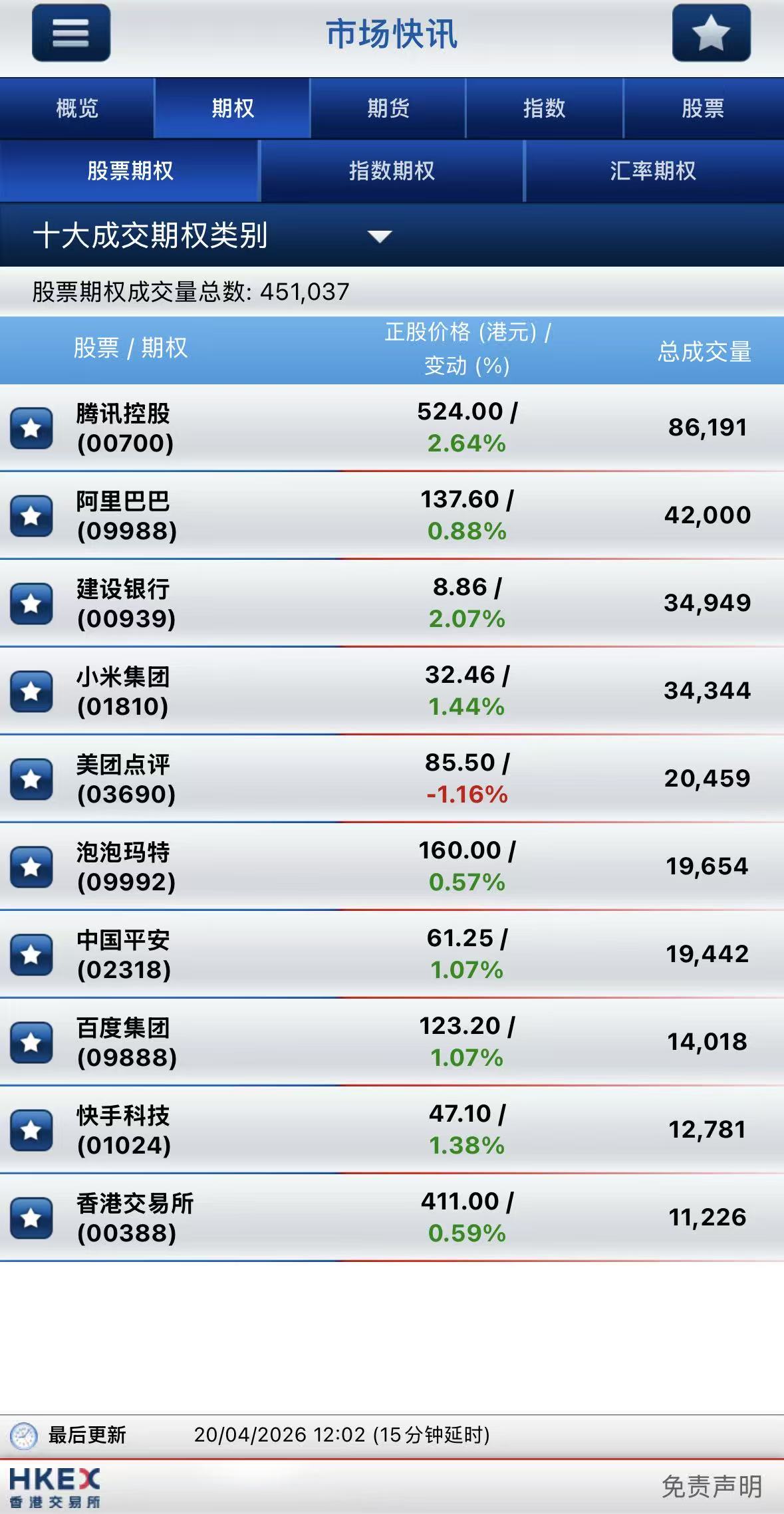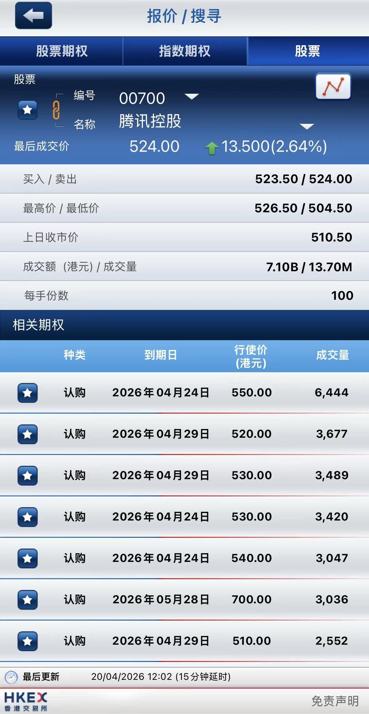 权重科技股多数表现活跃,其中腾讯控股涨2.64%股价盘中重上525港元;期权方面,腾讯控股半日成交超8.6万张,其中于4月24日到期行使价550港元的认购期权成交居前,成交6444张。