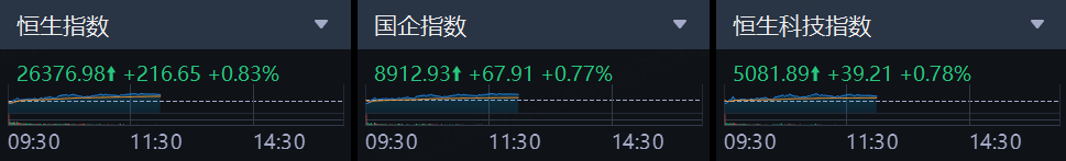 4月20日,港股上午盘三大指数集体上涨,截止午盘,恒生指数涨0.83%,国企指数涨0.77%,恒生科技指数涨0.78%。